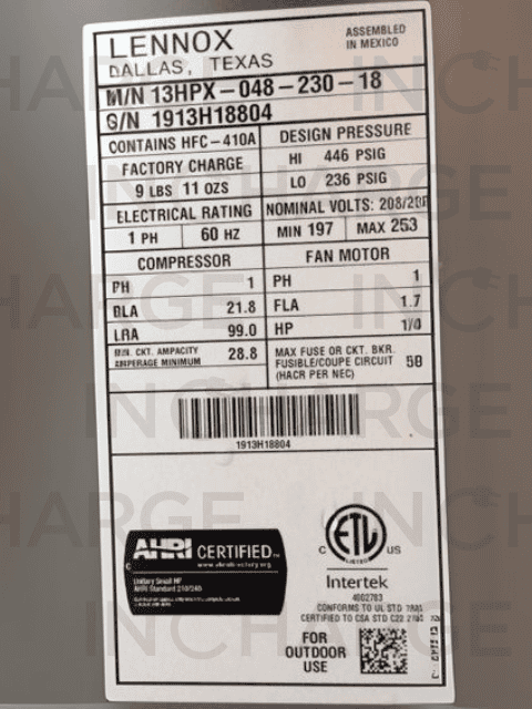 Upload a picture of the info tag located on the outside of your central A/C Unit. This may be very worn-out. Repeat this for each A/C Unit available.